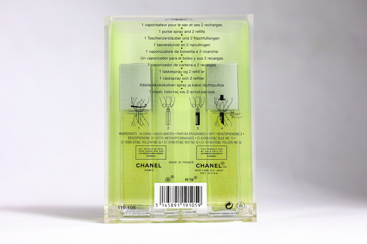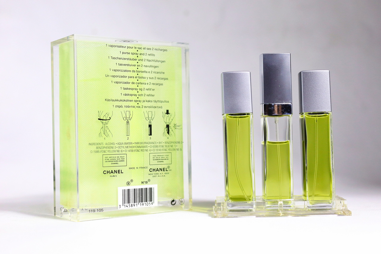 📝 รายละเอียด: CHANEL N°19 EDT 15ml x3 Purse Spray แบบสเปรย์พกพาพร้อมรีฟิลล์ รุ่นสเปรย์พกพาในรุ่นแรกๆ จาก Chanel เป็นขวดสเปรย์ที่รีฟิลล์ได้โดยวิธีเปลี่ยนหัวสเปรย์ไปขวดรีฟิลล์ มาในกล่องอคิลิคใส ขวดน้ำหอมสภาพดี ส่วนสีเงินของหัวสเปรย์มีฝ้าขาวไม่เงาวาว ปริมาณน้ำหอมขวดสเปรย์เหลือเกินครึ่งขวด ขวดรีฟิลล์ 2 ขวด ปริมาณน้ำหอมเต็มขวด มาพร้อมกล่องสมบูรณ์ พิจารณาจากภาพประกอบ