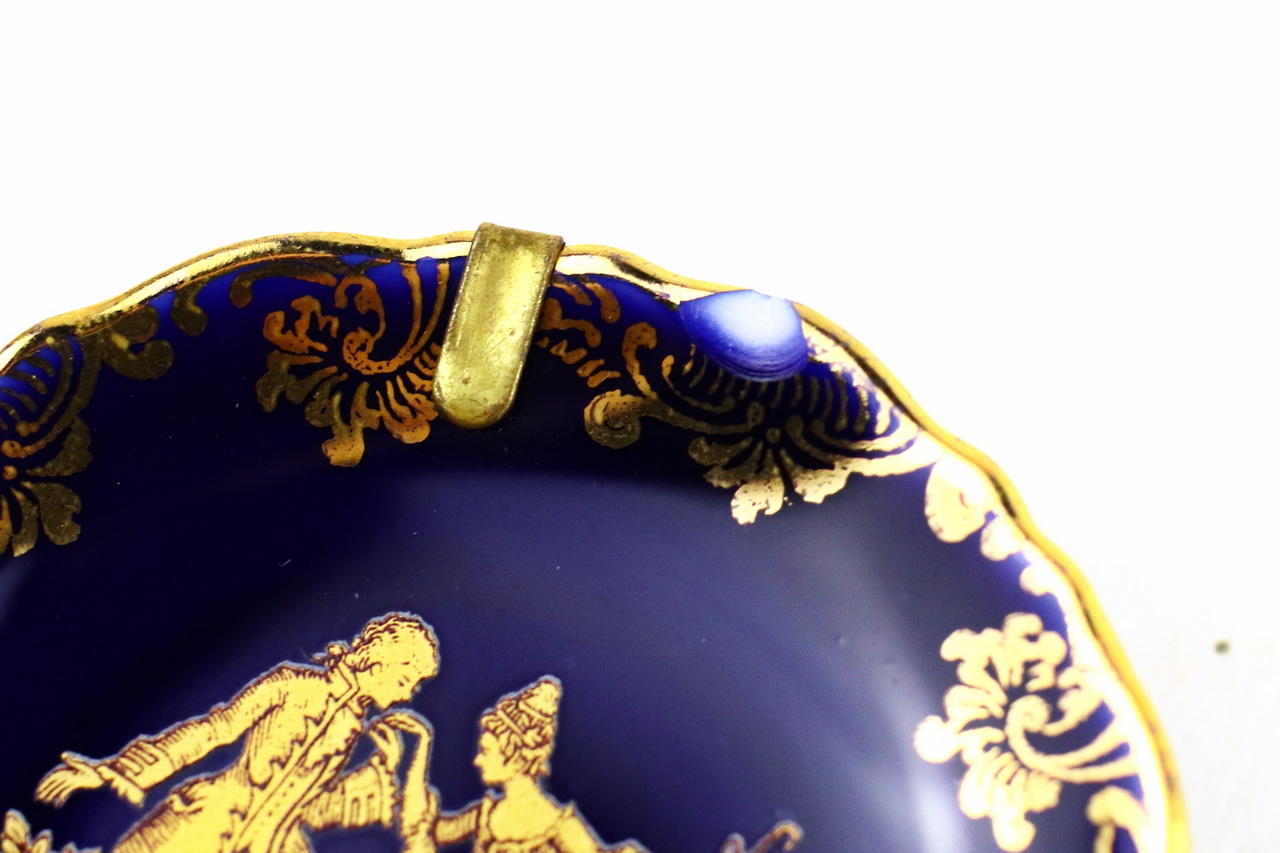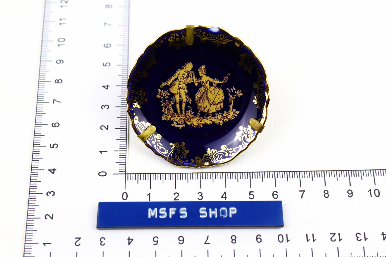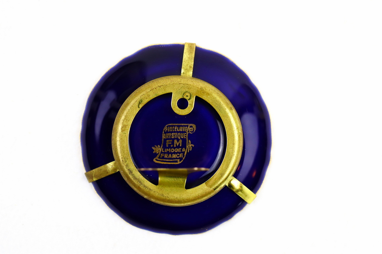 📝 รายละเอียด: จานกระเบื้องประดับ ขนาดเล็ก PORCELAIN ARTISTIQUE F.M. LIMOGES FRANCE สีน้ำเงินลงลายสีทอง สภาพดี มีขอบบิ่นกะเทาะ 1 จุด บริเวณด้านบน มีที่แขวนพนัง และที่ตั้งโชว์ พิจารณาจากภาพประกอบ