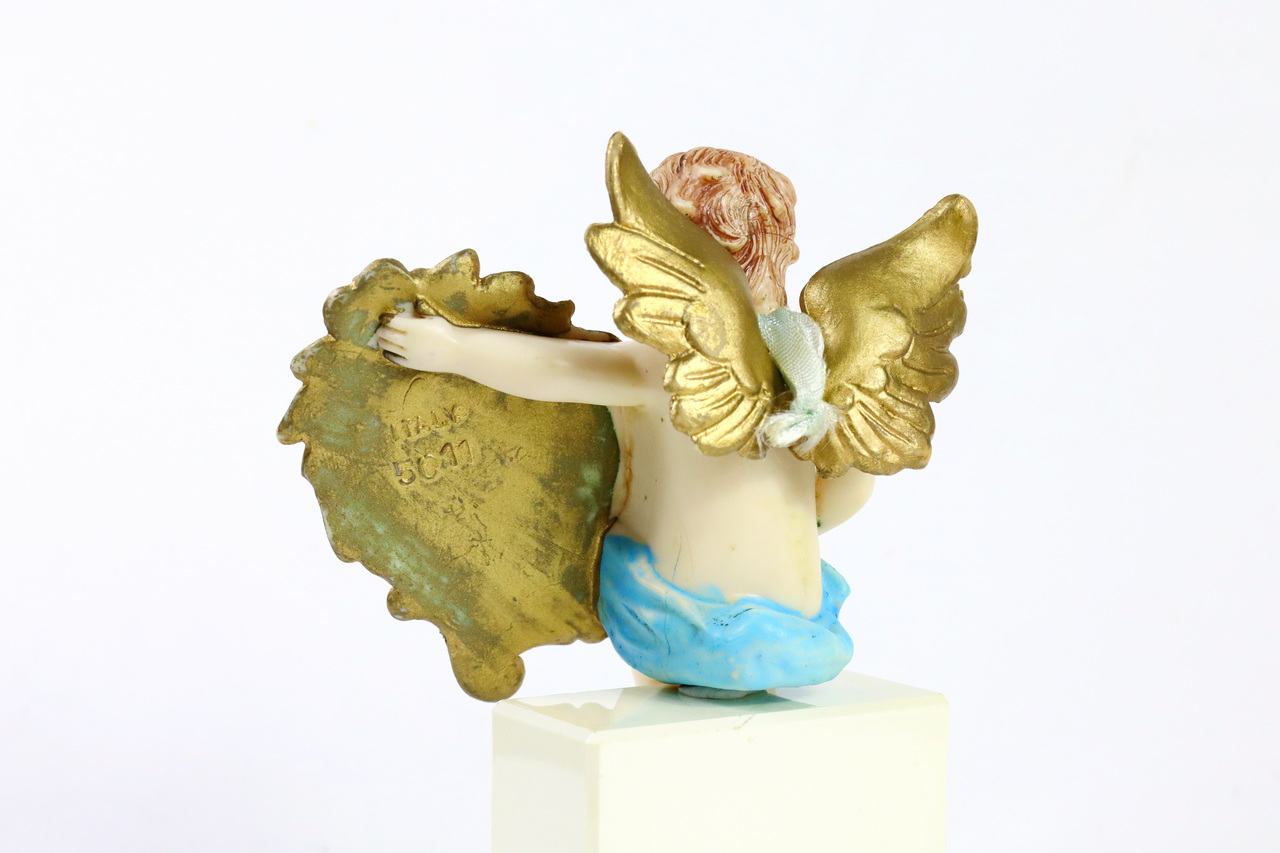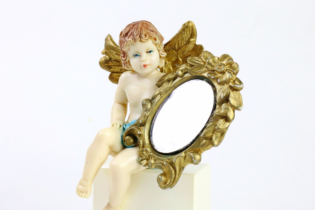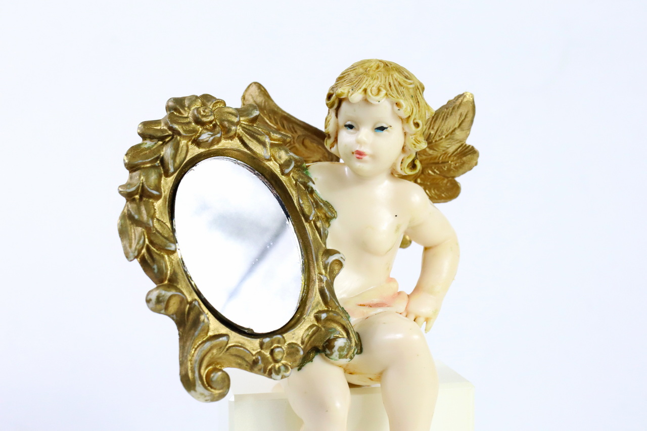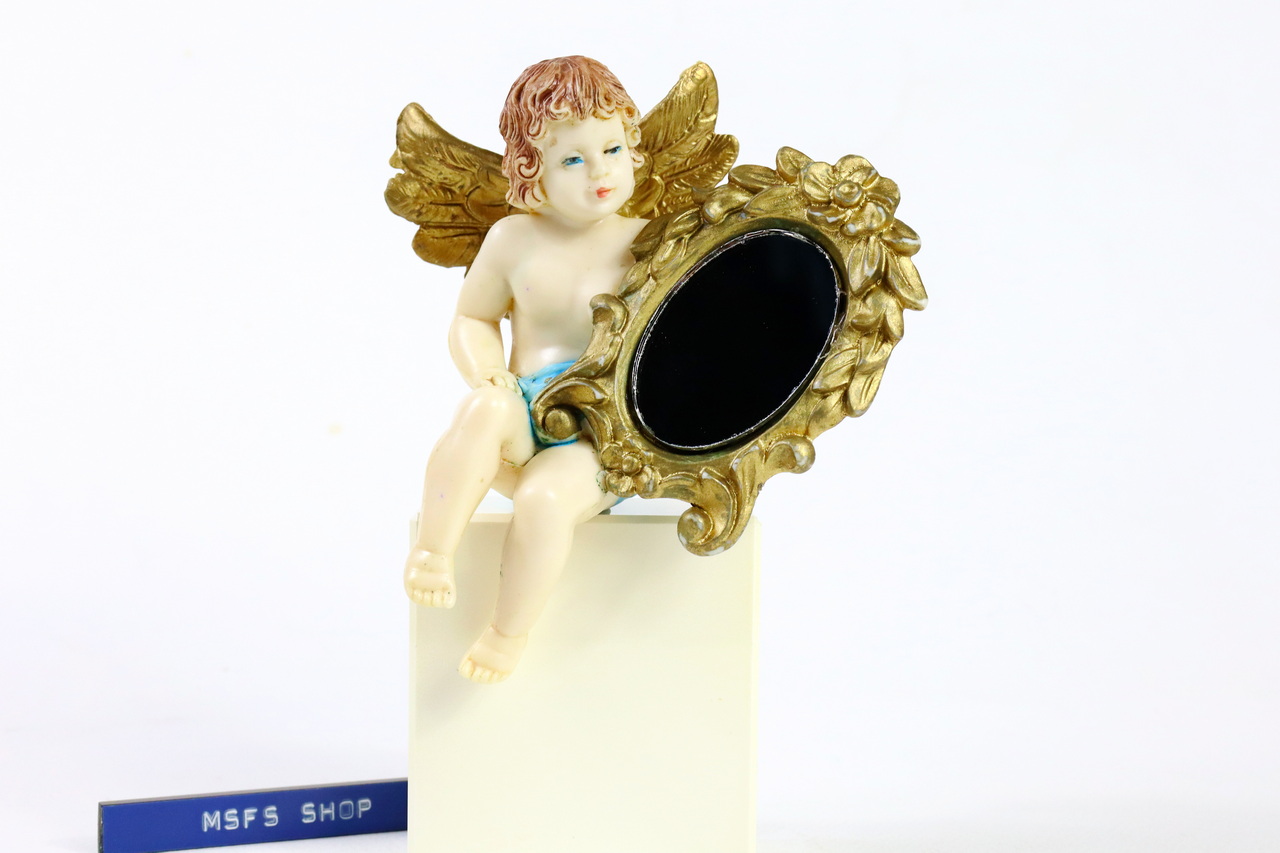 📝 รายละเอียด: ตุ๊กตาคิวปิด นั่งถือกระจก Christmas Ornament แบบ A ของเก่าสภาพดีพอใช้ พลาสติกเป็นพลาสติกเรซิ่น มีสีลอกรอบๆ ตัวตุกตา มีรอยขูดขีด ตกหล่นบ้าง ตามกาลเวลา สภาพเหมาะแก่การสะสม พิจารณาจากภาพประกอบ